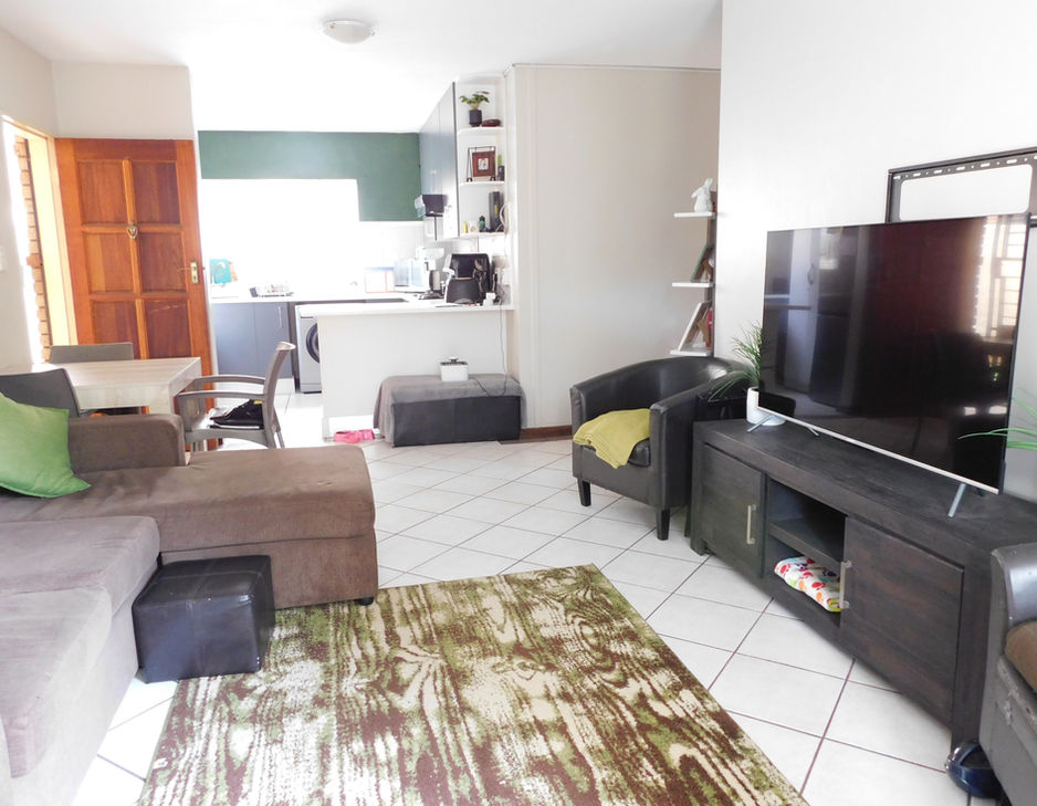 The tiled lounge seamlessly extends to a covered patio with a built-in braai, ideal for entertaining.